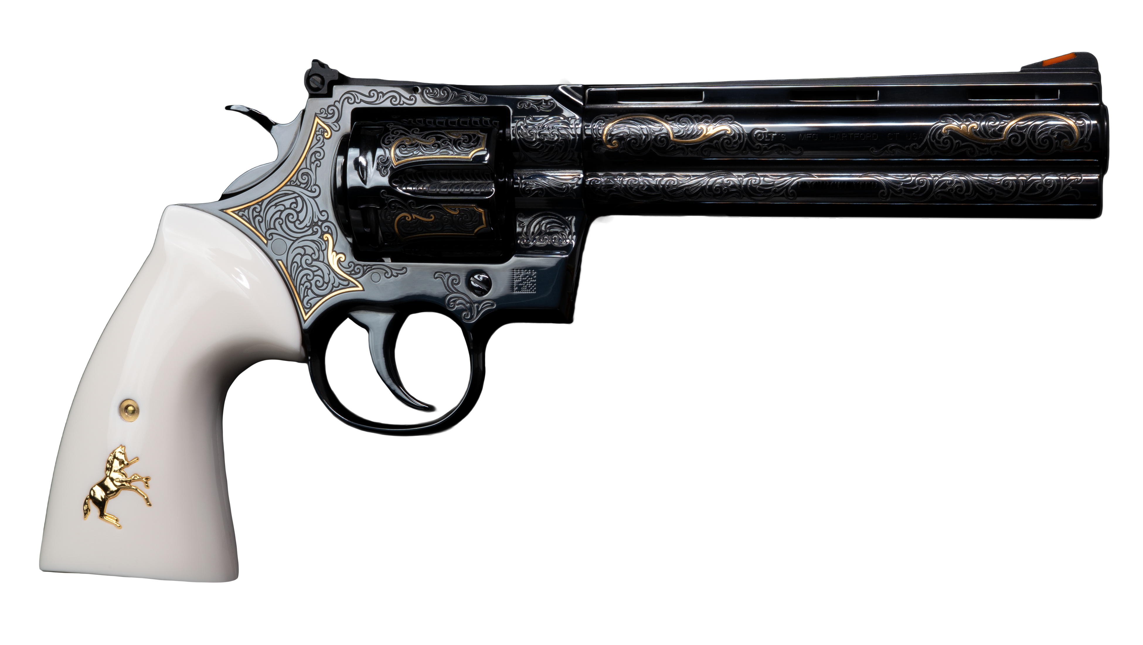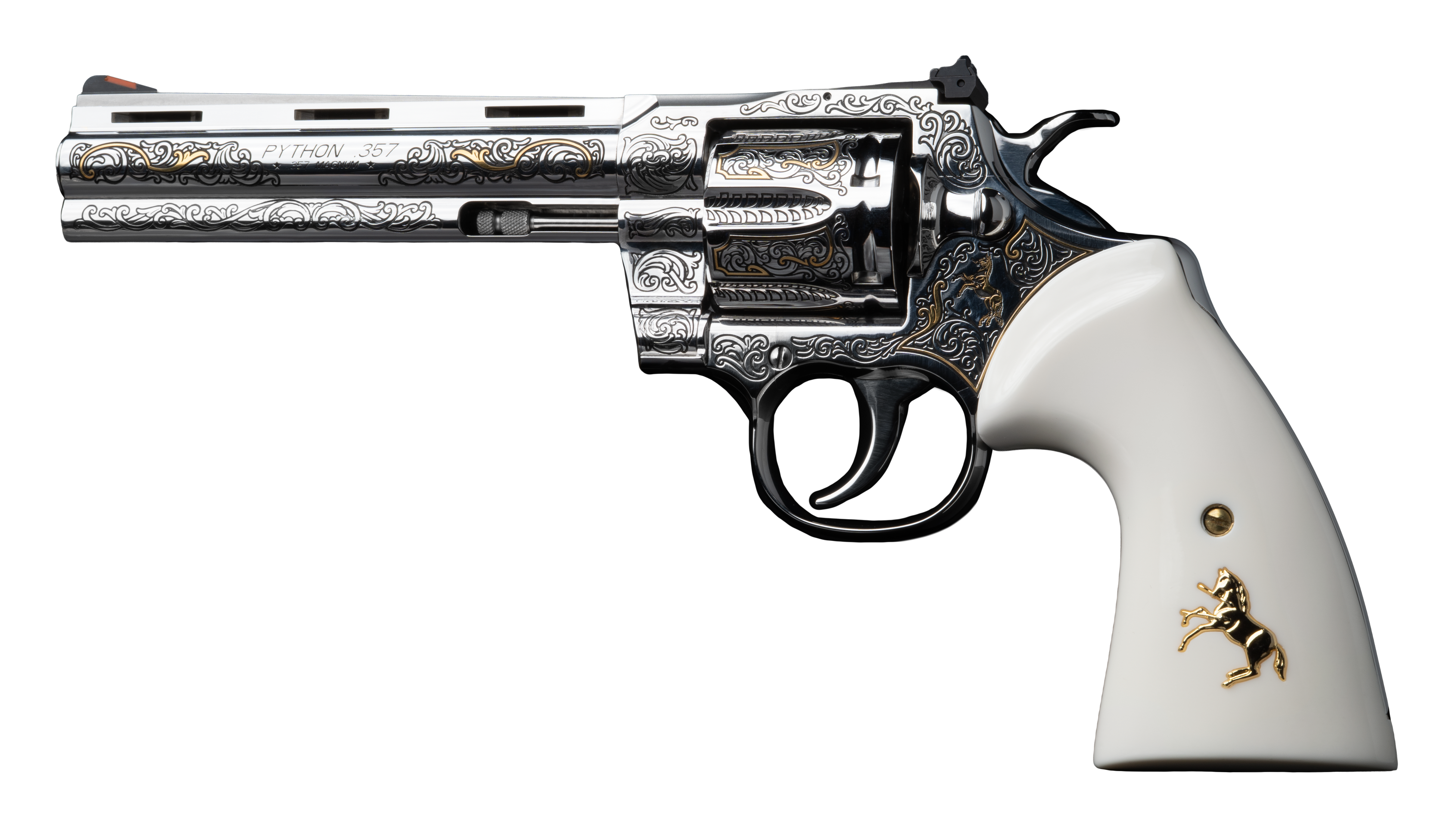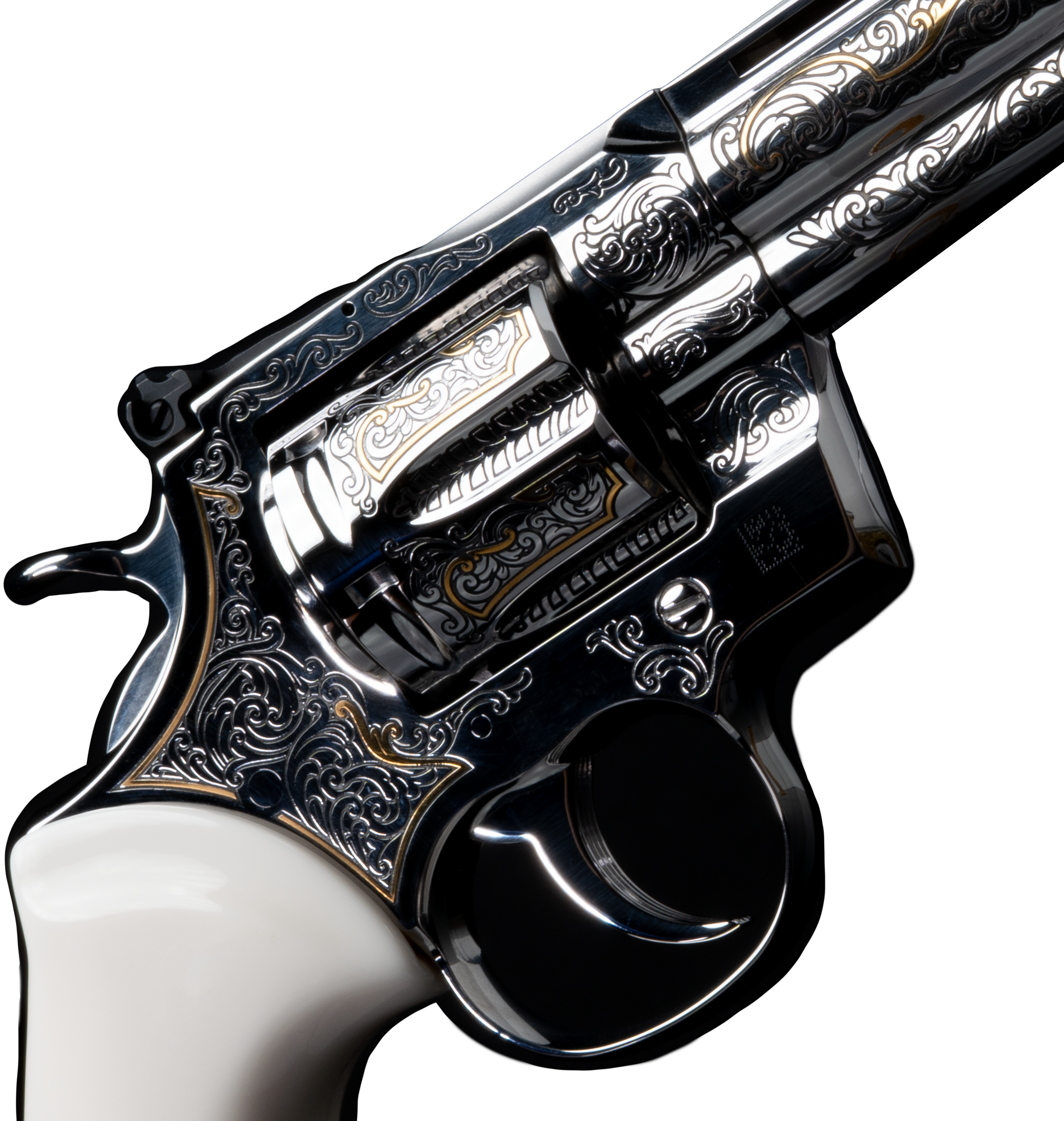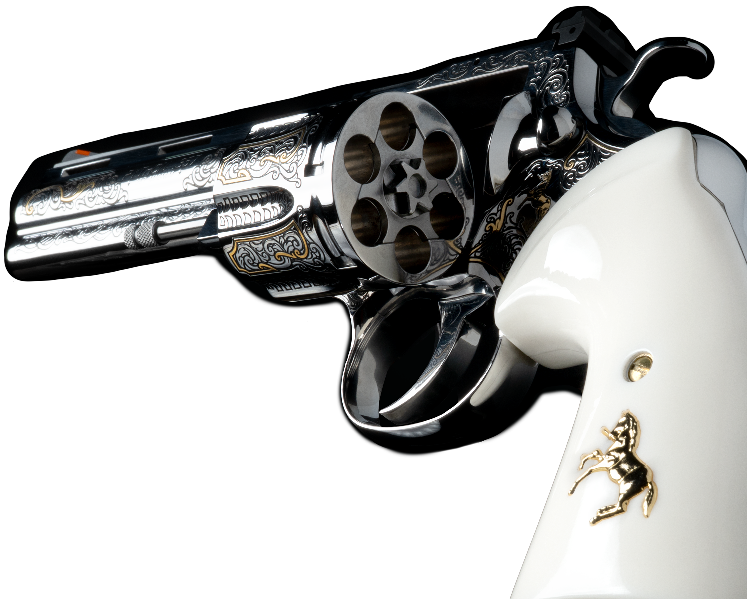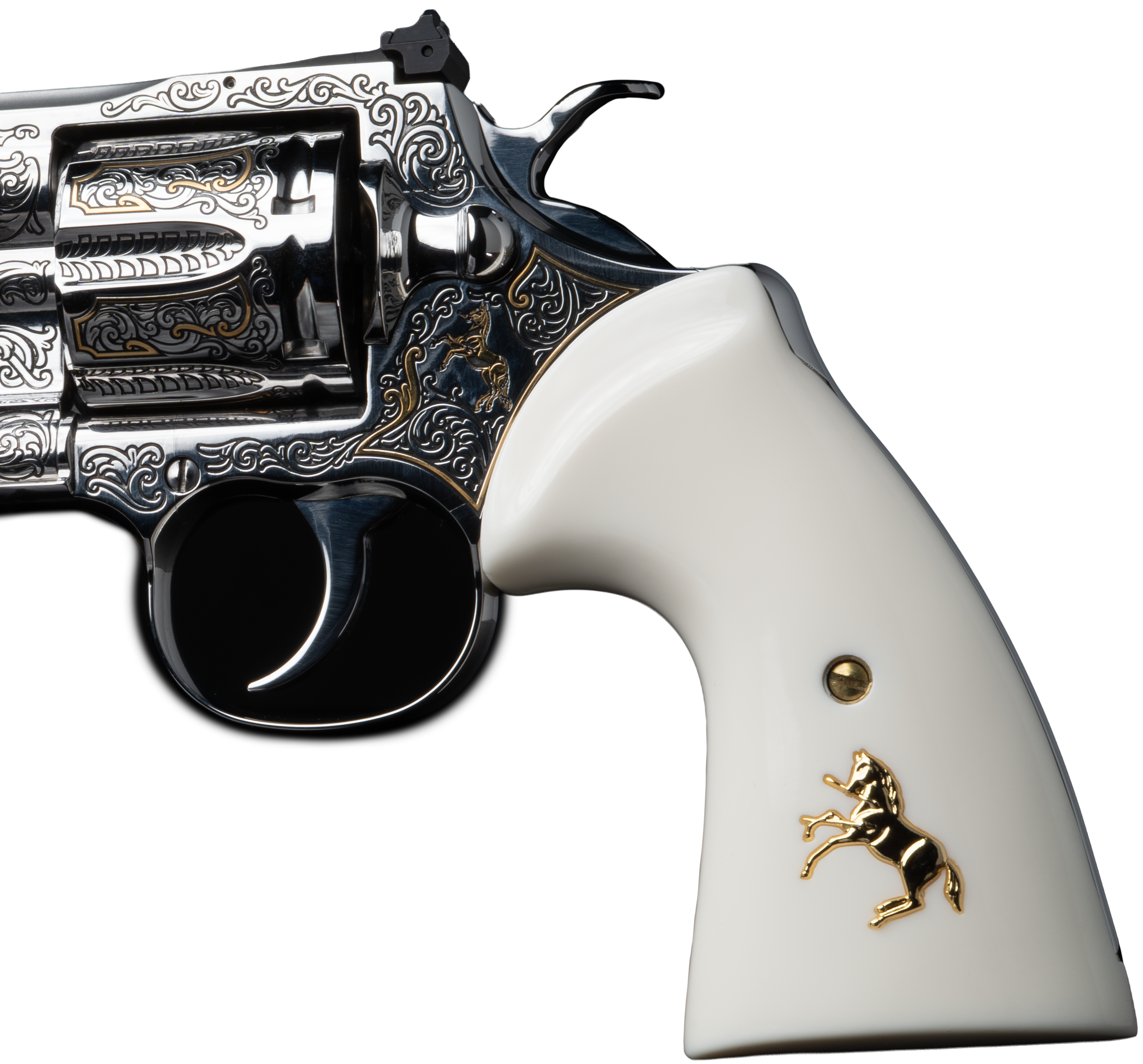 The custom high polish highlights the elegant lines of the revolver, and white Kirinite™ grips embedded with a gold Rampant Coltcomplete the look.